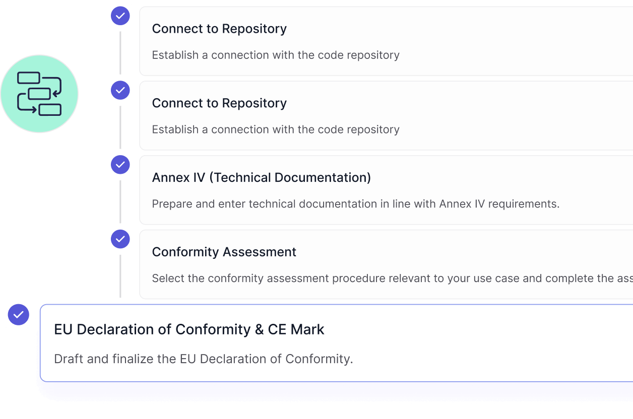 Simplify your path to CE marking and regulatory conformity. Follow built-in workflows that outline every requirement, track progress, and generate draft declarations of conformity in line with EU standards.